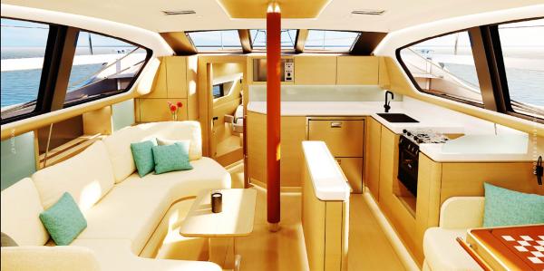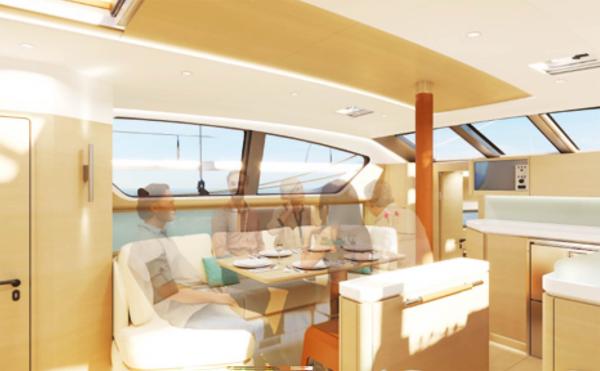„Und innen, auch wenn es kein echter Decksalon ist, da der Salon nicht erhöht ist, wirst Du einen „Decksalon-Effekt“ haben: Selbst im Sitzen kann man nach draußen sehen. Mit Isabelle Racoupeau haben wir die Innenaufteilung neu gedacht. Die Idee war, der Pantry eine noch zentralere Rolle zu geben. Angenehm, sowohl an Ankerplätzen als auch auf See. Der Salon wurde zu einer Lounge, mit einem niedrigen Tisch (der immer noch hochgeklappt werden kann, um 6 Personen bequem Platz zu bieten). In der Mitte bildet eine zentrale Insel die Raumaufteilung und schafft neue Nutzungsmöglichkeiten – wie in einer modernen Wohnung, wo Freunde sich für einen Drink treffen. Wir haben aber nicht alles verändert: Ganz im Sinne der ALLURES-DNA behält die Horizon 47 einen Kartentisch mit zwei Sitzen, der auch als Büro dienen kann. Isabelle hat mit ihrem einladenden Design, den weichen Formen und warmen Materialakzenten ihre Handschrift eingebracht. Das Ganze wirkt raffiniert, aber zurückhaltend.“